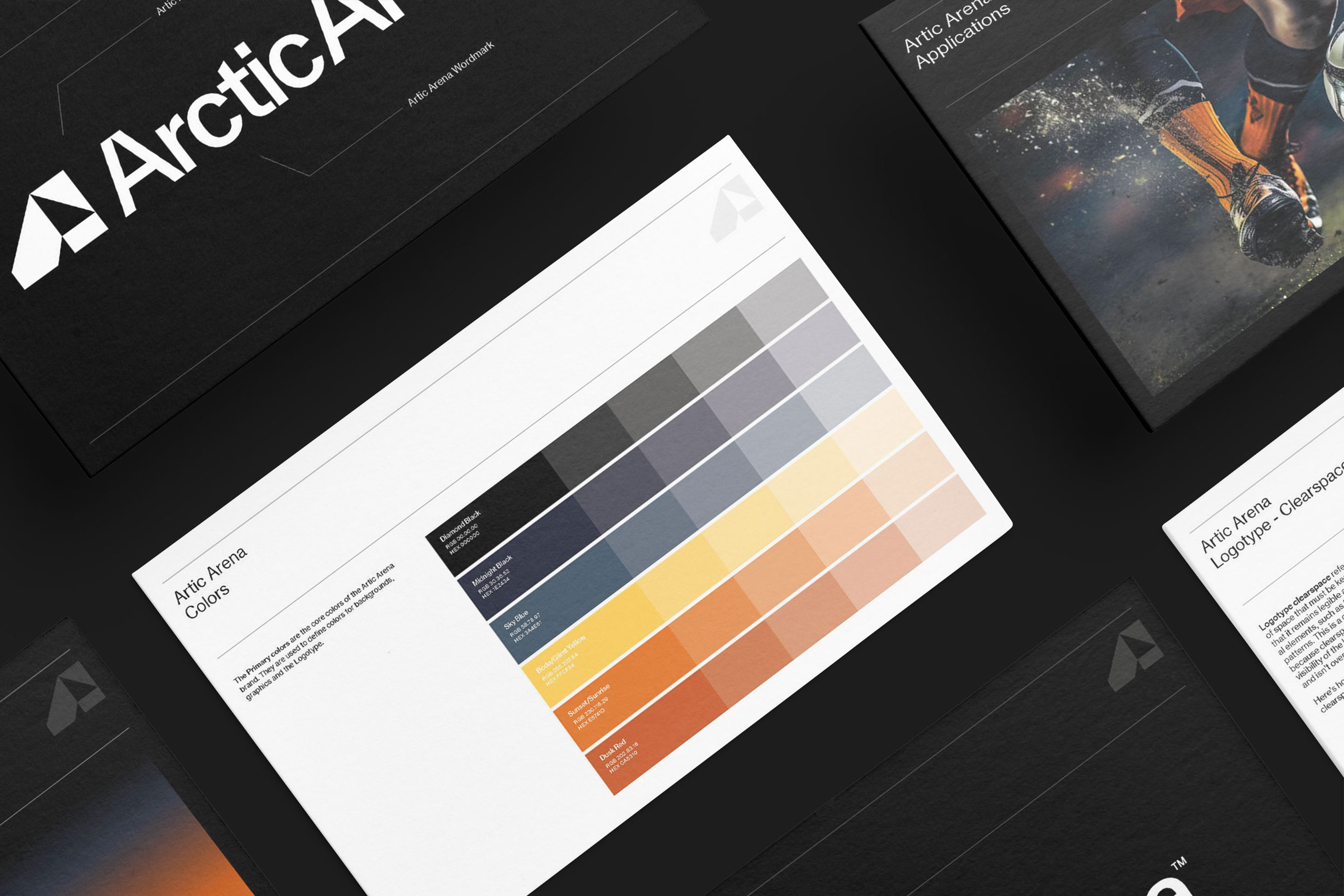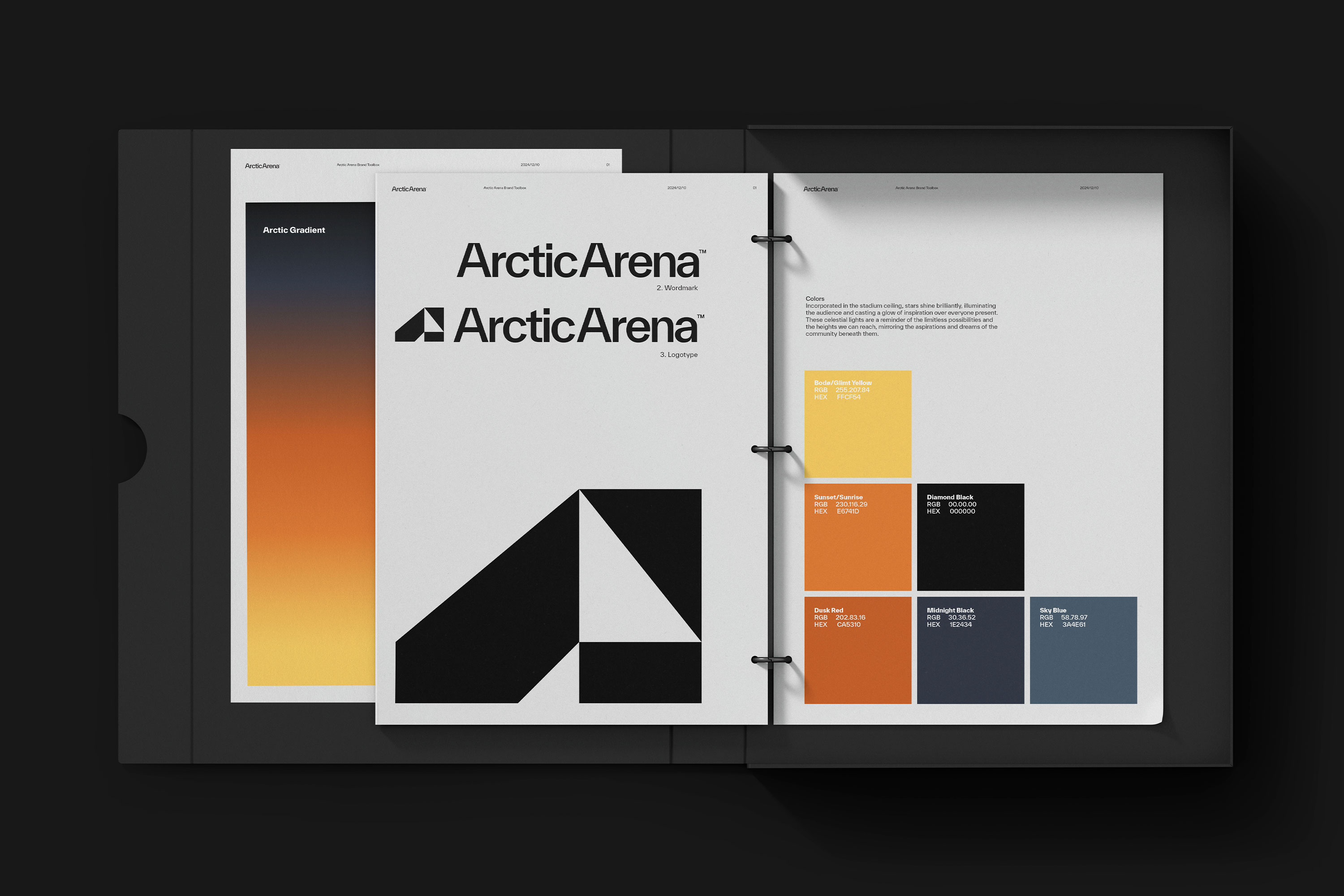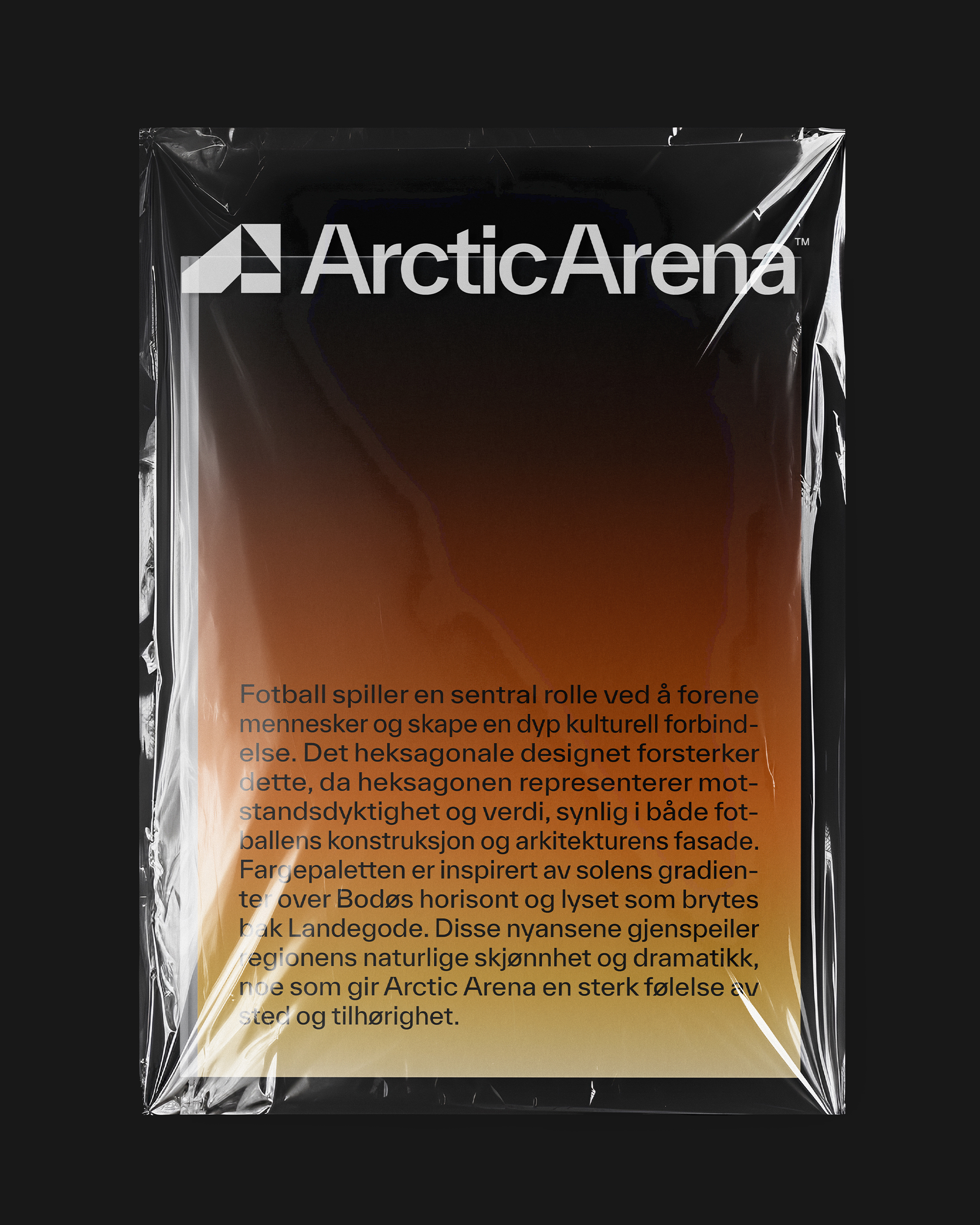 Equally strong is the bespoke wordmark for the Arctic Arena. The wordmark, inspired by the geometry in the architectural expression, balances elegance and aspiration with simplicity and straightforwardness. The standout strict geometrical "A" symbol — a play on platonic solids — incorporates key design elements such as the arena’s facade, the interplay of light and shadow (contrast), and the shape of a soccer field — all crafted as a dynamic, ever-changing shape. This bold, simplified design provides a strong visual signature for the project.