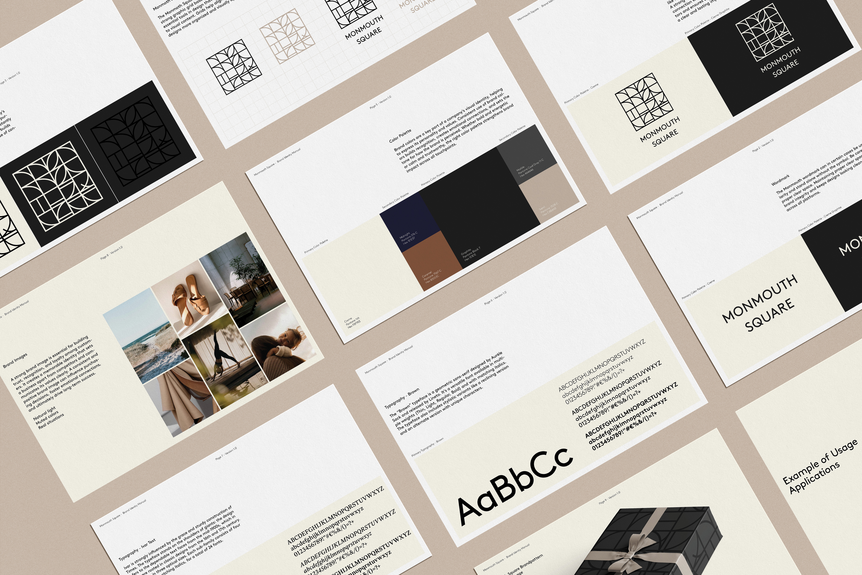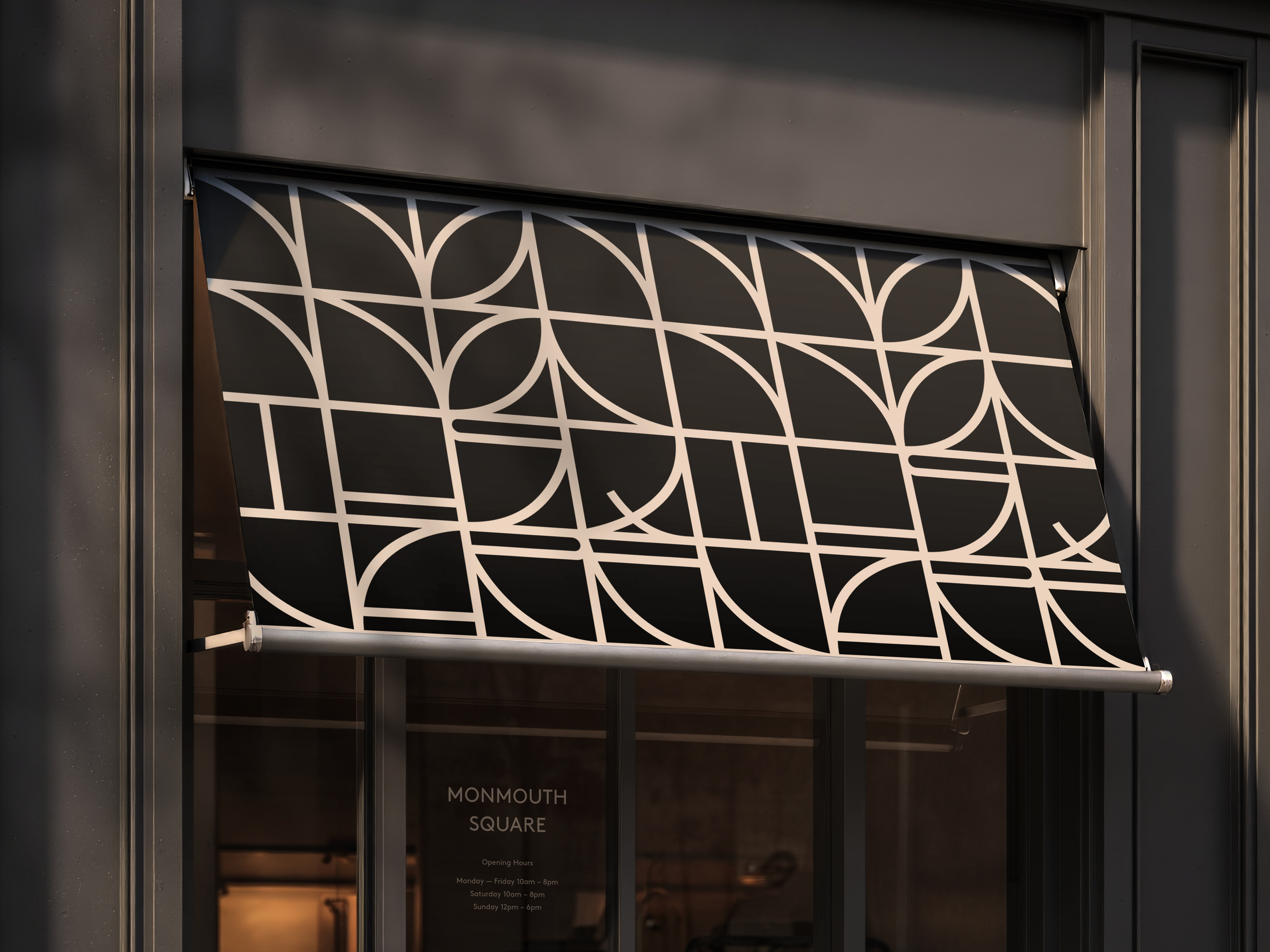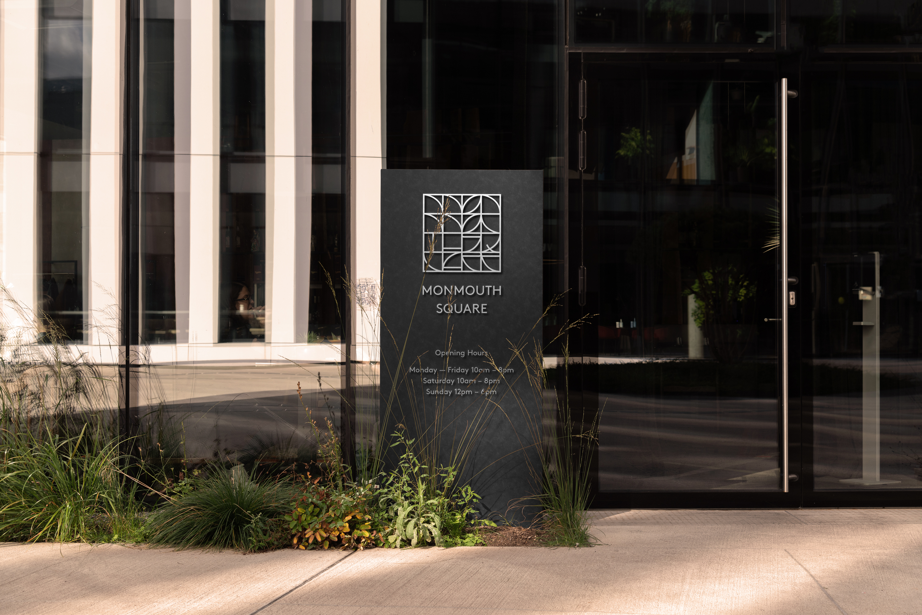 The centerpiece of the brand identity is a geometric symbol that serves as both a logo and a repeating brand pattern. This symbol is ingeniously constructed from the letters of "MONMOUTH SQUARE," arranged in strict geometric forms. Beyond its typographic roots, the design draws inspiration from old-style garden ornaments and wrought-iron fences, evoking a sense of timeless elegance. Its aesthetic pays homage to the Vienna Secession movement of the early 1900s, where arts and crafts flourished as a central part of society. Influenced by the design legacy of the Wiener Werkstätte, the symbol embodies the sophistication and creativity of that era, reinterpreted for a modern context.