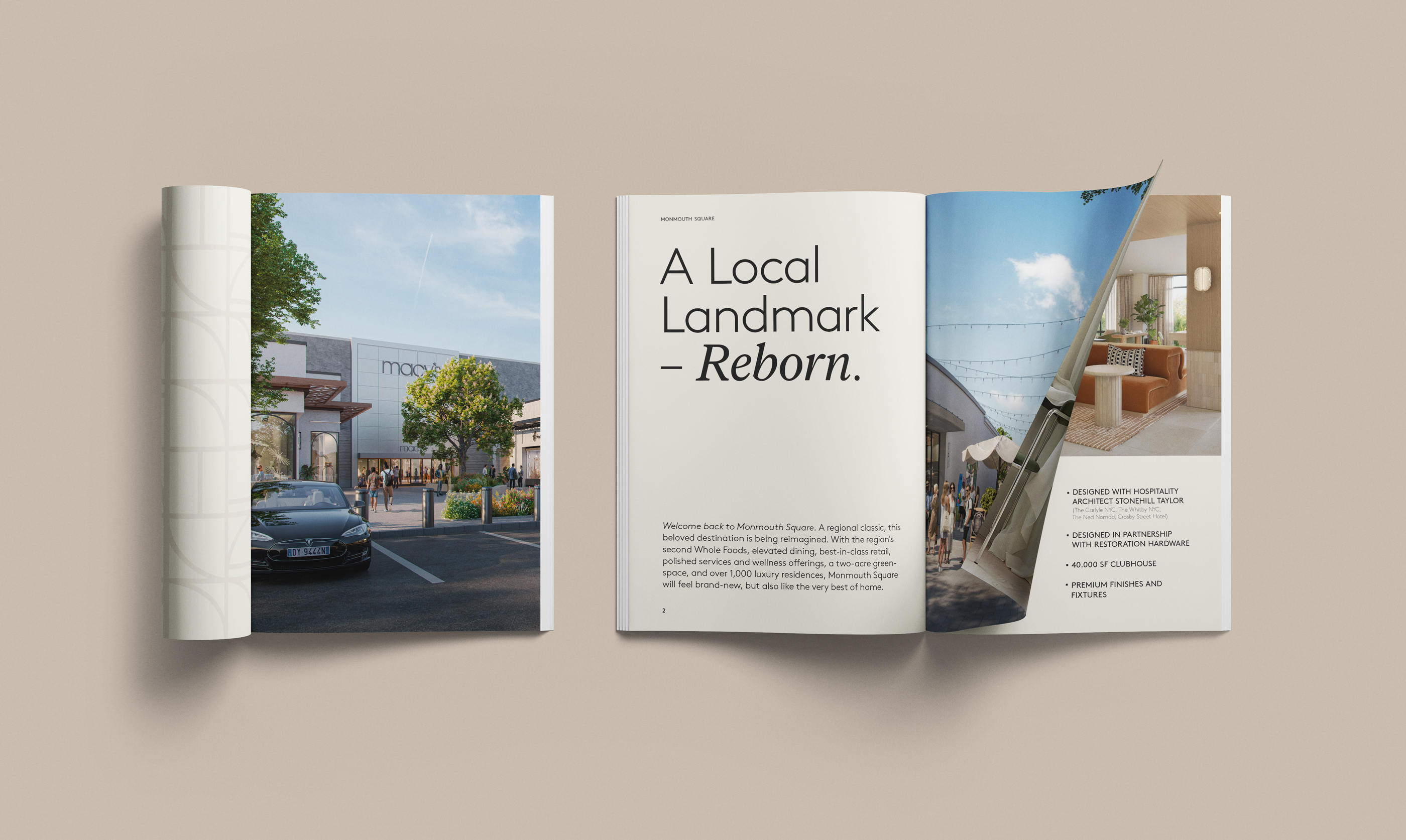 ADC’s design expertise extended to the creation of a visually compelling leasing sales folder, which integrates the refreshed brand identity with dynamic layouts, bold typography, and high-quality imagery. The folder highlights key attractions like Whole Foods Market, Apple Store, Zara, expansive green spaces, and luxury residences, while the signature geometric patterns add a modern and cohesive flair. Lifestyle photography, showcasing moments of community, modern interiors, and local highlights, brings the Monmouth Square experience to life, appealing to both prospective tenants and residents.