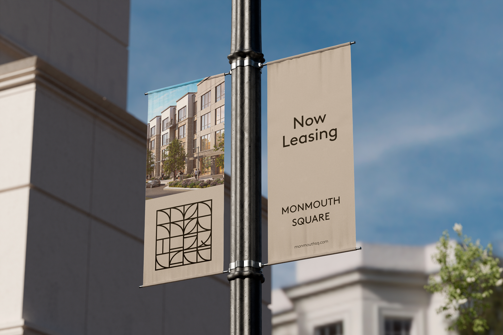 The brand’s color palette, inspired by its proximity to the Jersey Shore, features four primary tones: Creme, Graphite, Sand, and Caramel. These colors were thoughtfully chosen to reflect an elevated and sophisticated style while capturing the natural beauty and coastal charm of Monmouth Square. Creme provides a light, airy foundation, reminiscent of ocean breezes, while Graphite introduces depth and sleek elegance, evoking the look of wet stones along the shore. Sand offers a soft, natural warmth, reflecting the gentle hues of the beach, and Caramel adds a rich, earthy accent, inspired by sunlit dunes. Together, these tones create a harmonious, serene, and refined aesthetic that perfectly aligns with the modern, upscale character of Monmouth Square and is seamlessly integrated across all brand touchpoints.